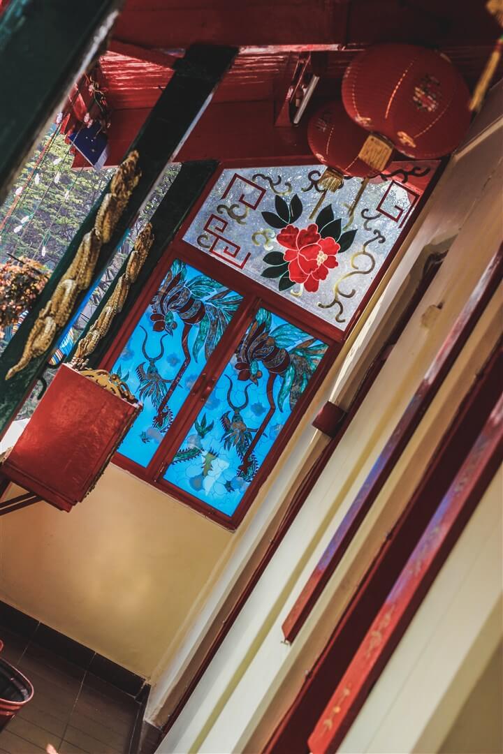 The small balcony with the main door to the shrine at the right. The building was decorated with lanterns of all sizes. I loved the glass paintings too.