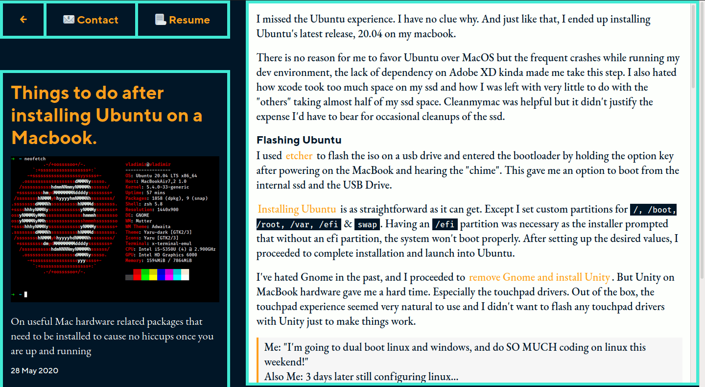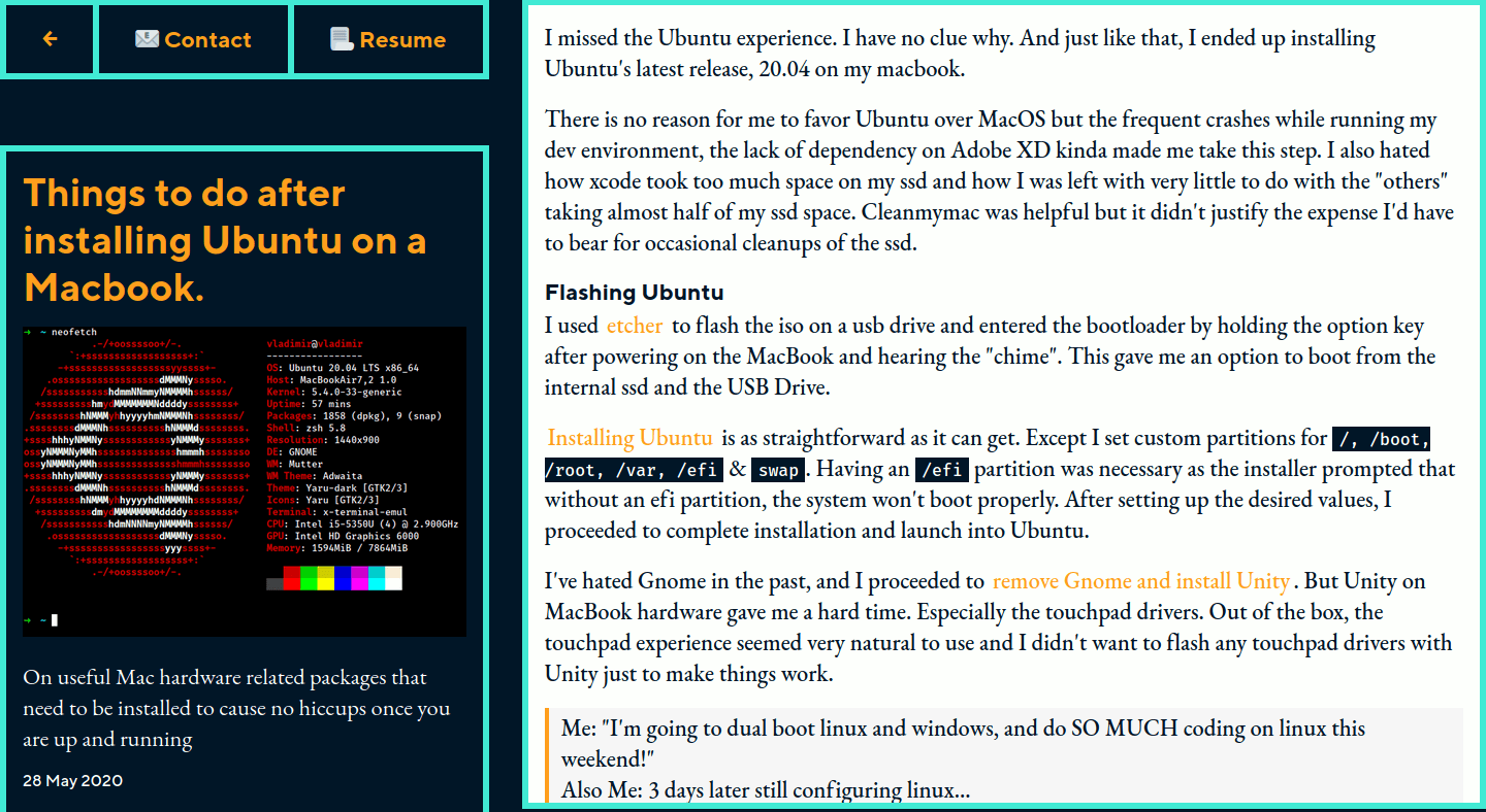 After switching to Ubuntu on my Macbook Air, I saw how the blog was rendered on the browsers and immediately, the scrollbar looked very out of place with the overall theme I've put together. And I had to get rid of it anyhow.